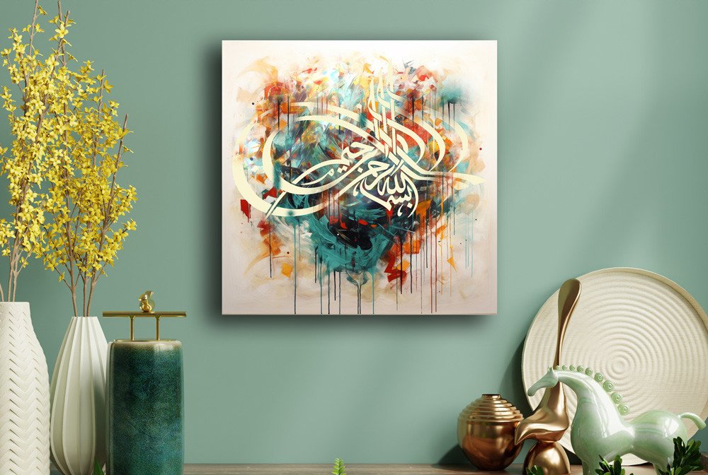 This high-quality design features the sacred phrase "Bismillah-ir-Rahman-ir-Raheem", symbolizing the start of all good things in Islam. The elegant brush-style script layered over a hand-painted effect background gives it a soulful, artistic touch suitable for both traditional and contemporary spaces.