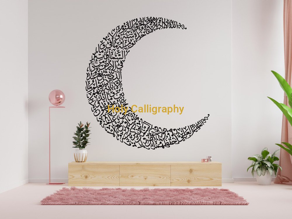 Bring elegance and spiritual meaning to your space with this beautifully designed Ayatul Kursi in a crescent shape. This digital artwork showcases sacred verses from the Quran intricately written in graceful Arabic calligraphy, forming a symbolic crescent moon that embodies Islamic tradition and divine protection.